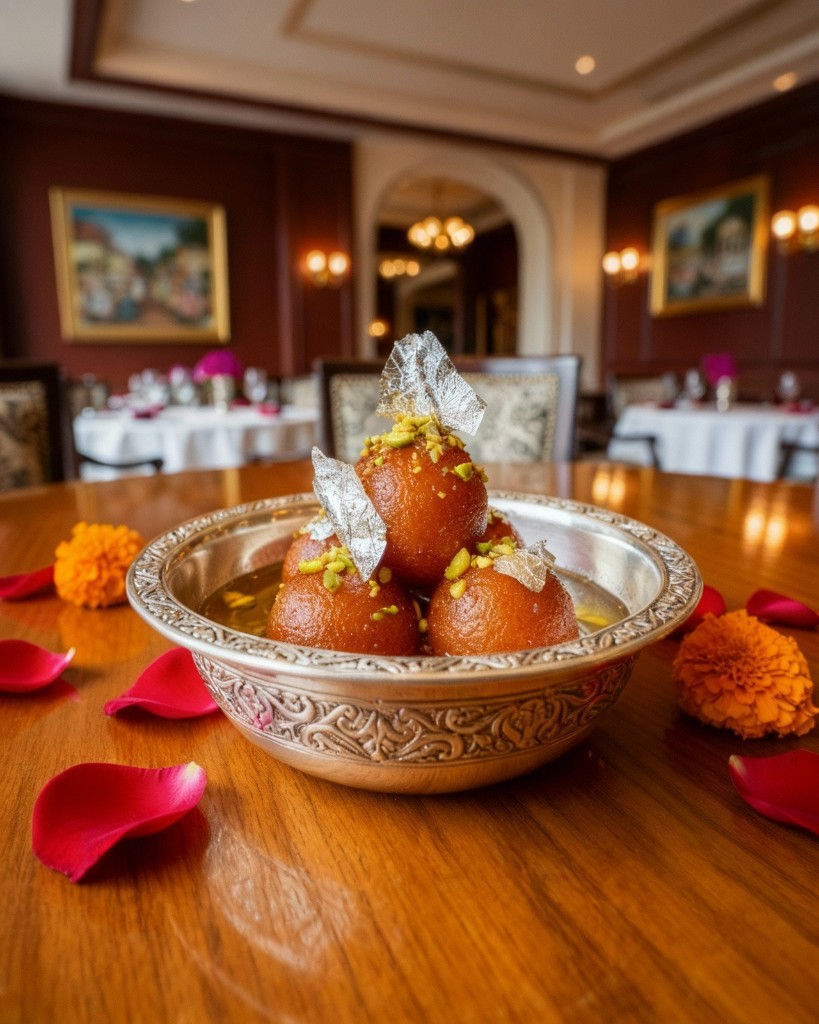 Gulab jamun and mohanthal barfi arranged on a tiered dessert display